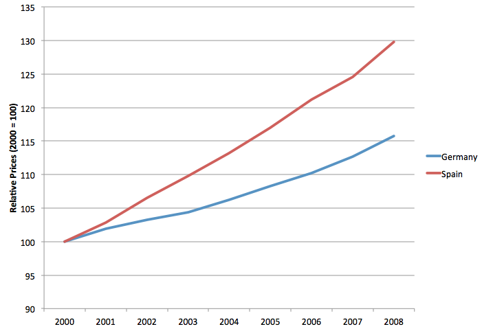 During the good years of the Euro, Spain’s economy did well. Adoption of the single currency led to huge capital inflows from German banks to Spanish banks. The German banks’ perceived risk of lending lots to Spanish banks (and the Spanish banks’ perceived risk of borrowing lots from German banks) reduced significantly (and erroneously) once they were all using the same currency. The German banks thought that since they were both on the same currency now, lending to Spain was like lending to Germany. The Spanish banks eagerly accepted the German loans and invested them in the Spanish housing bubble (they didn’t call it a bubble at the time). As more and more money passed from Germany to Spain the bubble grew, Spanish wages increased and Spanish prices increased.