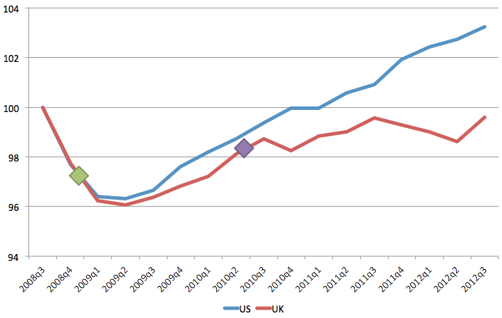 (The green diamond is when Obama came to power and the purple diamond is when Cameron came to power.)
