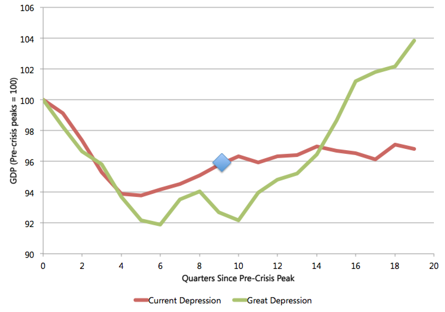 Now that’s a pretty stark difference and it’s not like I’m comparing things with a small economic hiccup – that green line is The Great Depression.